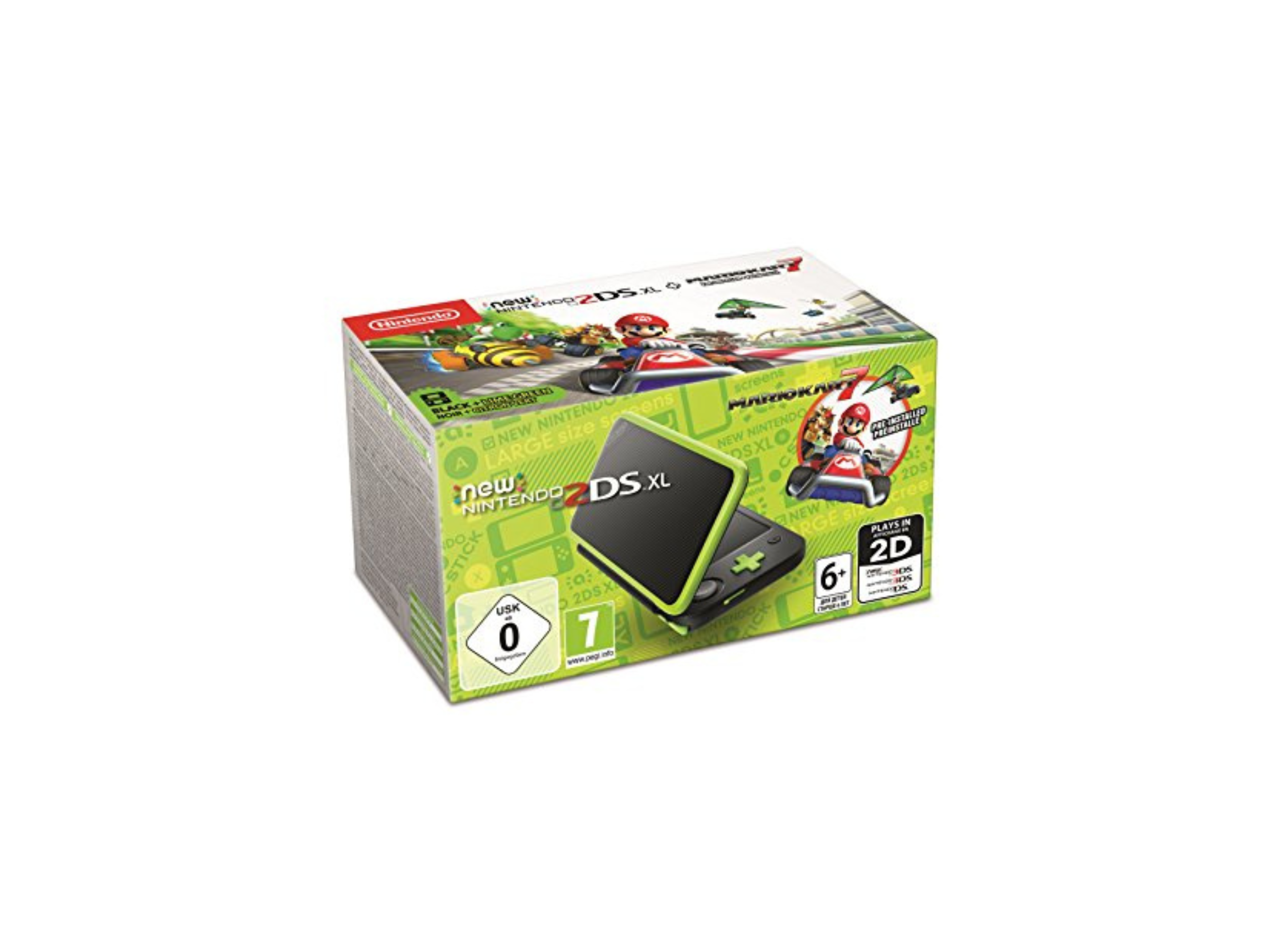 New Nintendo 2DS XL [inkl. Mario Kart 7 vorinstalliert] Schwarz/Grün, Stromkabel, Eingabestift